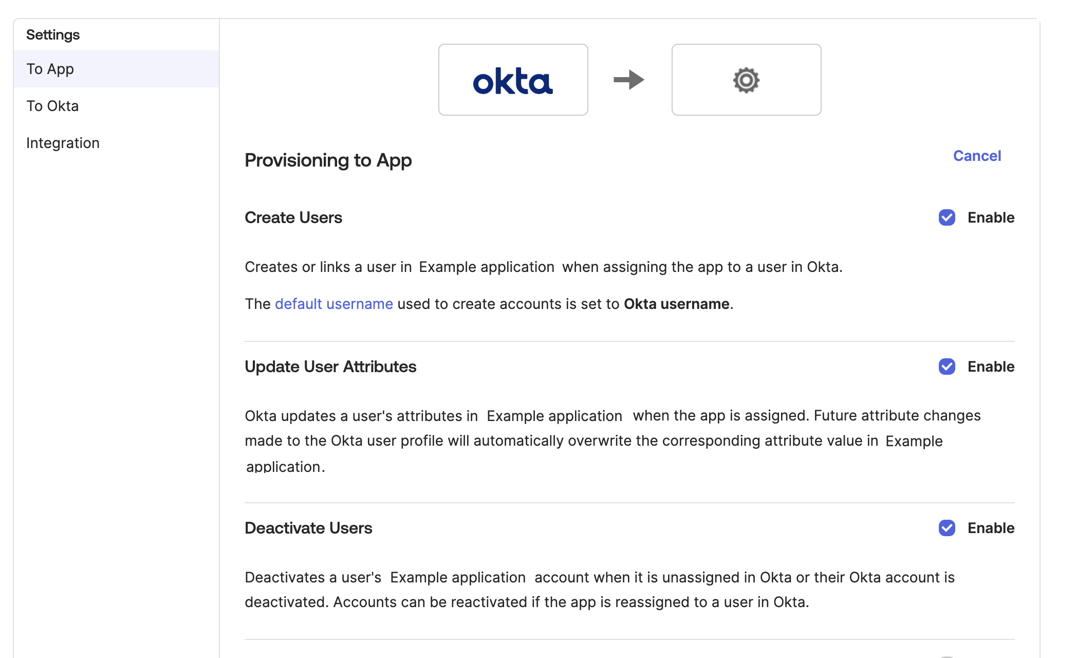 Check the Create Users, Update User Attributes and Deactivate Users options under the Provisioning to app settings.